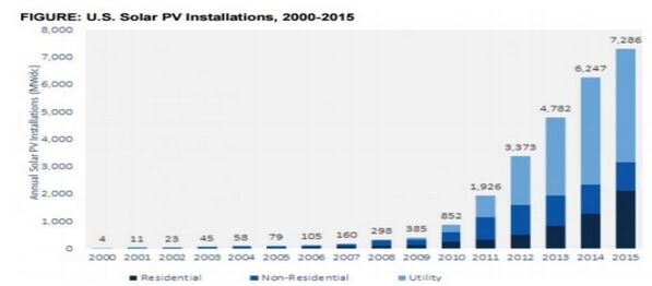 從國外市場情況來看,2015年,全球光伏市場強勁增長,新增裝機容量預計超過50GW,同比增長16.3%,累計裝機容量超過230GW。傳統(tǒng)市場如日本、美國、歐洲的新增裝機容量將分別達到9GW、8GW和7.5GW,依然保持強勁發(fā)展勢頭。新興市場不斷涌現(xiàn),光伏應用在東南亞、拉丁美洲諸國的發(fā)展勢較快,印度、泰國、智利、墨西哥等國裝機規(guī)模快速提升,如印度在2015年達到2.5GW。根據(jù)GTMResearch和美國太陽能產(chǎn)業(yè)協(xié)會(SEIA)數(shù)據(jù),美國2015年安裝7.3GW太陽能。這是第一年該國安裝的太陽能發(fā)電量超過天然氣。2015年太陽能占所有新增電力裝機量的29%。