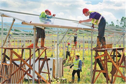 7月14日,工人在蒙山縣光伏扶貧發(fā)電站安裝光伏板。該縣在西河鎮(zhèn)桐油坪工業(yè)園區(qū)投資2.05億元,發(fā)展集光伏扶貧發(fā)電、觀光旅游、生態(tài)農(nóng)業(yè)于一體的光伏發(fā)電扶貧項(xiàng)目,建成后將為每個(gè)參與家庭實(shí)現(xiàn)年增收4500元以上。