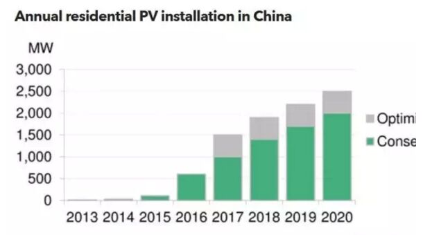 2017年,中國的戶用光伏新增裝機容量會超過1GW,超過2016年為止的累計裝機容量。BNEF預(yù)測,至2020年,中國的家庭屋頂光伏累計裝機容量將接近10GW,至2040年將超過100GW。