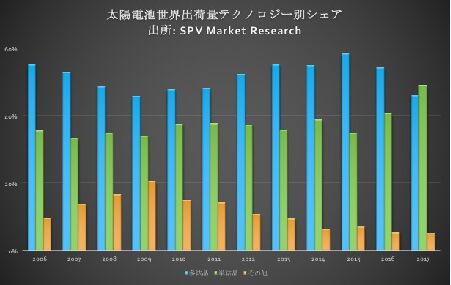 圖2太陽(yáng)能電池板類型和世界光伏發(fā)電市場(chǎng)類型的市場(chǎng)份額趨勢(shì)(2006-2017年)(來(lái)源:SPV市場(chǎng)研究)