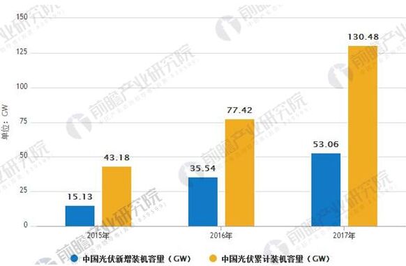2015 -2017年中國(guó)光伏新增裝機(jī)容量及累計(jì)裝機(jī)容量情況