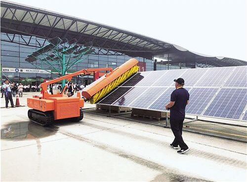 日前,在第十二屆(2018)國際太陽能產業(yè)及光伏工程展覽會上,某參展商正在使用一臺大型光伏清潔機做演示。