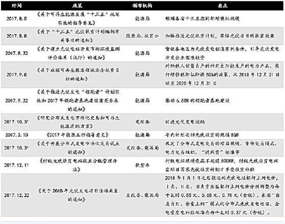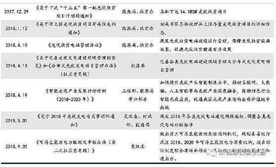 光伏制造各環(huán)節(jié)成本持續(xù)下降,平價上網(wǎng)即將來臨。2018H1,硅料、硅片、電池片、組件環(huán)節(jié)的制造成本(含稅)已降至65.00 元/kg、3.45 元/片、1.31 元/W、2.27 元/W,系統(tǒng)成本約5.4 元/W。補貼退坡倒逼光伏制造企業(yè)通過產(chǎn)能擴張和技術(shù)進步不斷降低生產(chǎn)成本,平價上網(wǎng)即將來臨。平價上網(wǎng)假設(shè)下,光伏各環(huán)節(jié)成本將進一步下降,硅料、硅片、電池片、組件環(huán)節(jié)的制造成本(含稅)分別約為45.00元/kg、2.10元/片、0.77 元/W、1.56元/W,系統(tǒng)成本約3.29元/W。 531 政策短期沖擊明顯,有利于推動平價上網(wǎng)。2018年5月31日,三部委聯(lián)合發(fā)布《關(guān)于2018年光伏發(fā)電有關(guān)事項的通知》,政策影響主要體現(xiàn)在以下兩個方面:從短期來看,指標限制導(dǎo)致我國2018 年光伏裝機需求下滑。根據(jù)政策安排,2018年暫不安排通光伏電站指標,安排10GW左右規(guī)模用于分布式光伏項目。從中長期來看,光伏補貼退有望推動平價上網(wǎng)加速實現(xiàn)。政策規(guī)定,自發(fā)文之日起,新投運的光伏電站標桿上網(wǎng)電價每千瓦時統(tǒng)一降低0.05元;新投運的、采用“自發(fā)自用、余電上網(wǎng)”模式的分布式光伏發(fā)電項目,全電量度電補貼標準降低0.05元。光伏補貼退坡能夠推動企業(yè)通過技術(shù)進步降低成本,光伏平價上網(wǎng)即將到來。 配額制即將落地,或?qū)⒅ζ絻r上網(wǎng)加速。2018年9月,發(fā)改委下發(fā)《可再生能源電力配額及考核辦法(第二次征求意見稿)》,提出建立可再生能源約束性消納機制,規(guī)劃各省級行政區(qū)2018、2020年可再生能源電力消費比例,對保障小時數(shù)以內(nèi)的集中式風(fēng)電、光伏電量以及其他非水可再生能源發(fā)電量施行全額保障性收購(考慮技術(shù)等限制因素最多限電5%)。配額制若能落地,必將提高光伏電站年利用小時數(shù),進一步降低度電成本,助力平價上網(wǎng)加速。近期光伏政策一覽表如下: