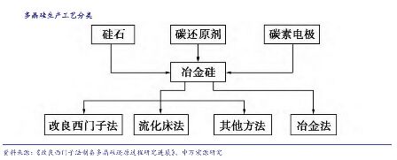 ③國內(nèi)多晶硅廠商成本優(yōu)于國外企業(yè),國產(chǎn)替代加速進行 目前,我國多晶硅企業(yè)生產(chǎn)成本已大幅優(yōu)于國外企業(yè),德國瓦克、韓國OCI生產(chǎn)成本約為90~100元/kg;而通威股份2017年生產(chǎn)成本約56元/kg,預計樂山、包頭新產(chǎn)能現(xiàn)金成本30元/kg,生產(chǎn)成本40元/kg,全成本50元/kg。未來國內(nèi)低成本新產(chǎn)能將逐步替代韓國OCI、德國瓦克等國外產(chǎn)能。 ④技術路線確定,改良西門子法成本下行空間較大 改良西門子法是目前工業(yè)生產(chǎn)中廣泛采用的多晶硅制備方法,市場應用占比超過90%。2017年投資成本約為14億元/萬噸,預計到2020年投資成本有望下降至8~10億元/萬噸,下降空間達28.6%。