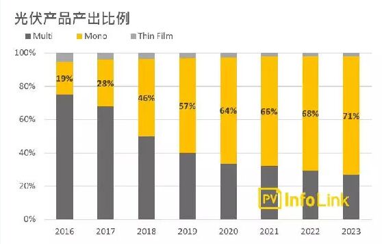 單晶產(chǎn)品持續(xù)強(qiáng)勢(shì)進(jìn)擊 2018年不僅有領(lǐng)跑者計(jì)劃的高單晶份額拉升國(guó)內(nèi)單晶占比、單晶PERC電池片效率也持續(xù)突飛猛進(jìn),造就18年成為單晶產(chǎn)品攻城略地的一年,市場(chǎng)單晶份額由2017年的28%進(jìn)展到2018年的46%。 展望2019年,單晶PERC主流組件瓦數(shù)可能在二季度即站上310W,與多晶組件仍以275W為多拉開(kāi)了35W的顯著差距,也讓海內(nèi)外市場(chǎng)選擇單晶組件的比重更加提升。 且后續(xù)還有硅片薄化能夠幫助降本、電池片仍有空間提效率等等,再加上明年新一波的領(lǐng)跑者可能又會(huì)再次讓市場(chǎng)看到組件瓦數(shù)的躍進(jìn),P型單晶產(chǎn)品持續(xù)挾高性價(jià)比在明年強(qiáng)勢(shì)進(jìn)擊。