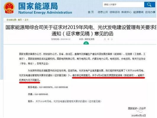 根據(jù)4月11日國(guó)家能源局綜合司發(fā)布的《關(guān)于征求對(duì)2019年風(fēng)電、光伏發(fā)電建設(shè)管理有關(guān)要求的通知(征求意見(jiàn)稿)意見(jiàn)的函》,今天是征求意見(jiàn)稿最后截止日。