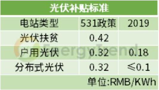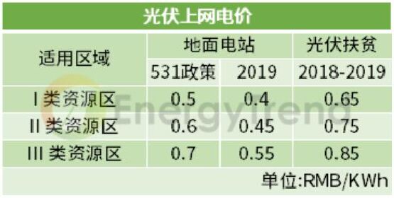 競價配置項目 上網(wǎng)指導(dǎo)電價:Ⅰ類地區(qū)0.4元/千瓦時、Ⅱ類地區(qū)0.45元/千瓦時、Ⅲ類地區(qū)0.55元/千瓦時。 集中式 531政策后,由于暫不安排2018年普通光伏電站建設(shè)規(guī)模,以及2019年度光伏政策未下發(fā)的不確定下,目前一季度光伏裝機容量為2.4GW。 2019年度的集中式光伏電站上網(wǎng)電價通過市場競爭方式確定,將三類資源區(qū)集中式電站標(biāo)桿上網(wǎng)電價改為指導(dǎo)價,不得超過所在資源區(qū)指導(dǎo)價。 工商業(yè)分布式 2019年7月開始,工商業(yè)分布式光伏項目一律通過競價方式進行指標(biāo)配置,無論是“自發(fā)自用,余量上網(wǎng)”的還是“全額上網(wǎng)”的項目,市場競爭形成的價格既不得超過指導(dǎo)價。 其中“自發(fā)自用,余電上網(wǎng)”的項目按全電量0.1元補貼,補貼標(biāo)準也不得超過每千瓦時0.1元。 已明確規(guī)模項目 戶用光伏 2018年531政策中,能源局明確了分布式規(guī)模10GW,但在今年戶用單獨配置的情況下,根據(jù)2019年一季度分布式光伏總量2.8GW,按財政部30億的補貼中,戶用7.5億配置來看,戶用光伏在0.18元的高補貼,擬定3.5GW的裝機規(guī)模下,還是極具吸引力的。 光伏扶貧 由于光伏扶貧項目不在財政部下發(fā)的30億元補貼的大盤子中,按單獨補貼計算,剩下的22.5億元光伏補貼將流入競價配置項目中。 而早些時候發(fā)布的“十三五”第二批光伏扶貧電站中提到,本次下達的光伏扶貧項目原則上應(yīng)在2019年底前全容量建成并網(wǎng),“十三五”第一批光伏扶貧項目須在2019年6月30日(含)前全容量建成并網(wǎng)。未按期建成并網(wǎng)的項目視為自動放棄,不再納入國家光伏扶貧目錄。 結(jié)合國家能源局第二批光伏扶貧電站下達的1.67GW裝機規(guī)模,加上2017年公布第一批扶貧電站4.2GW的裝機規(guī)模中未并網(wǎng)的項目,在上網(wǎng)電價仍維持每千瓦時0.65元、0.75元、0.85元執(zhí)行的情況下,光伏扶貧項目需求動能已全面開啟。
