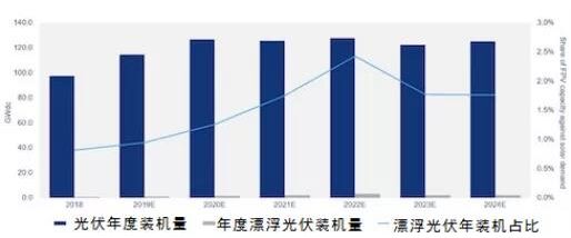 圖1:2018-2024年光伏年度裝機、漂浮光伏年度裝機及占比 (圖片來源:Wood Mackenzie電力和可再生能源)