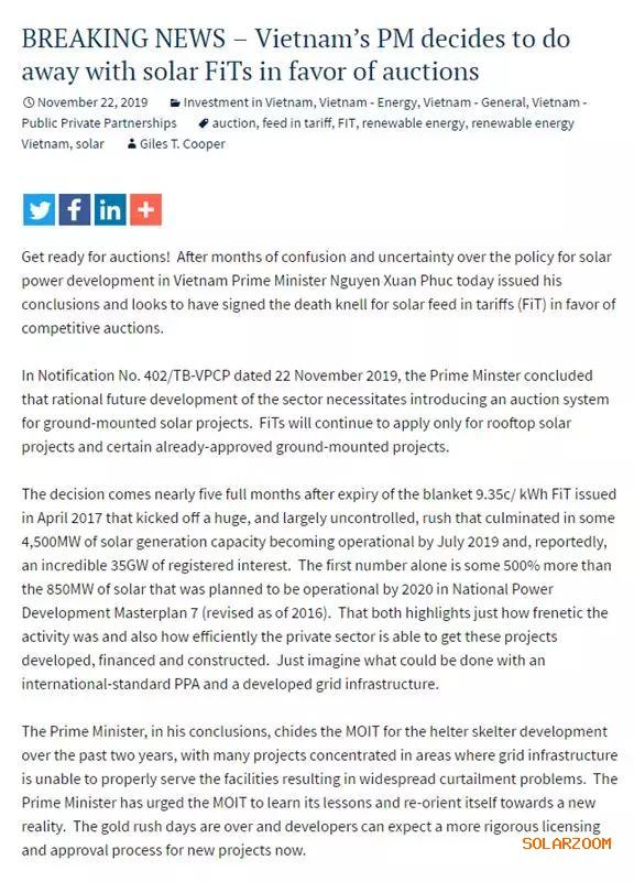 經(jīng)過近幾個月來光伏發(fā)展政策的混亂和不確定性之后,越南總理阮春福(Nguyen XuanPhuc)11月22日發(fā)布了他的結(jié)論,為了發(fā)展競價光伏項目,原來的固定上網(wǎng)電價補(bǔ)貼(FiT)似乎走到了盡頭。 在當(dāng)日的第402/TB-VPCP號通知中,阮春福表示為了光伏產(chǎn)業(yè)的合理發(fā)展,需要對地面光伏項目引入競價機(jī)制,上網(wǎng)電價補(bǔ)貼將只適用于屋頂太陽能項目和某些已經(jīng)獲得批準(zhǔn)的地面安裝項目。