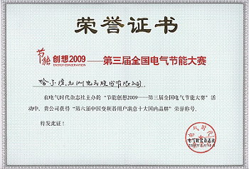 由電氣時代雜志社主辦,中國電機(jī)工程學(xué)會、中國電器工業(yè)協(xié)會變頻器分會、中國自動化學(xué)會協(xié)辦的“節(jié)能創(chuàng)想2009——第三屆全國電氣節(jié)能應(yīng)用技術(shù)論壇及第六屆變頻器用戶滿意十大品牌發(fā)布”在北京舉行。哈爾濱九洲電氣股份有限公司被評為“十大品牌”之一。此次發(fā)布會有來自電力、石化、冶金、水處理、水泥、煤炭、建筑、交通、紡織和通用機(jī)械等領(lǐng)域的專家及用戶代表等180多人參加。