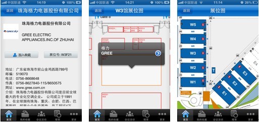(五)參展名單&展位圖 在“參展名單”中可查看所有參展企業(yè)的會刊信息。點開任意一家展商名稱,該公司的名稱、地址、電話、傳真、網(wǎng)址和簡介便一目了然(見圖7)。點擊該公司的展位號,將自動跳轉(zhuǎn)到“展位圖”頁面,顯示出該公司的具體方位(見圖8)。通過“展位圖”您可以看到W1-W5,E1-E3八個展廳的展臺具體分布情況,實現(xiàn)對目標(biāo)展商的快速定位。(見圖9)