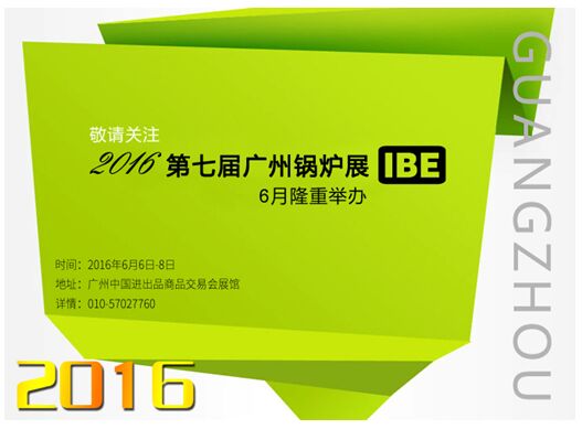 2016第七屆廣州鍋爐展暨:2016第七屆中國國際節(jié)能環(huán)保鍋爐展覽會(簡稱IBE),由中國低碳產(chǎn)業(yè)協(xié)會環(huán)保鍋爐委員會發(fā)起;擬邀8家行業(yè)權(quán)威組織機構(gòu):1萬平米展出面積,300余家優(yōu)秀廠家、2萬專業(yè)觀眾即將于2016年6月6日-8日集聚廣州•中國進出品商品交易會展館。 目前組委會已開放在線登陸平臺,需要了解項目的企事業(yè)單位及個人均可通過登陸:http://www.guoluzhan.com/6/cgdj.asp進行免費參觀登記,需要發(fā)布項目的廠家也可以登陸http://www.guoluzhan.com/6/czdj.asp進行展位預(yù)選提交。詳情咨詢:010-57027760,敬請關(guān)注!