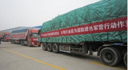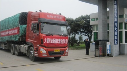 圖為大明燈業(yè)送往新疆武警后勤部20萬套T5高效節(jié)能熒光燈的送貨專用車