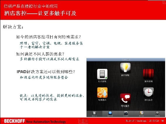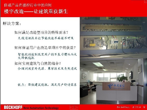 2013 年 6 月 9 日上午,由千家網(wǎng)主辦的“2013年綠色智能建筑運(yùn)維管理趨勢(shì)論壇”在廣州進(jìn)出口商品交易會(huì)展館A區(qū)6.1號(hào)館隆重舉辦,活動(dòng)邀請(qǐng)了國(guó)內(nèi)外知名企業(yè)高層與業(yè)界精英針對(duì)“綠色智能建筑運(yùn)維管理趨勢(shì)”問(wèn)題進(jìn)行了深入地探討與交流,與會(huì)人員各抒己見(jiàn),共話當(dāng)前綠色智能建筑運(yùn)營(yíng)、維護(hù)、管理中的問(wèn)題及探討未來(lái)發(fā)展趨勢(shì)。 德國(guó)倍福自動(dòng)化有限公司技術(shù)支持工程師包立應(yīng)邀出席了本次論壇,并在論壇上作了名為“倍福產(chǎn)品在樓控行業(yè)中的應(yīng)用——樓宇自動(dòng)化新技術(shù)”的主題報(bào)告。報(bào)告介紹了倍福的智能樓宇行業(yè)產(chǎn)品和解決方案在樓宇自控、樓宇改造、酒店客控、智能照明等領(lǐng)域的技術(shù)優(yōu)勢(shì)和應(yīng)用情況,向現(xiàn)場(chǎng)與會(huì)的嘉賓展示了Beckhoff在智能樓宇行業(yè)的發(fā)展現(xiàn)狀和未來(lái)發(fā)展趨勢(shì)。 在樓宇自動(dòng)化領(lǐng)域,倍福(Beckhoff)可全方位的設(shè)計(jì)集成式樓宇自動(dòng)化方案:家居自動(dòng)化照明、幕墻控制、操作和監(jiān)控、中央空調(diào)系統(tǒng)(HVAC)、獨(dú)立房間控制、遠(yuǎn)程維護(hù)和能源數(shù)據(jù)記錄等。由于其開(kāi)放式接口是基于IT 和Windows 標(biāo)準(zhǔn)的,因此Beckhoff 基于PC和以太網(wǎng)的控制技術(shù)自然就非常適用于樓宇自動(dòng)化領(lǐng)域。此外、開(kāi)放性是倍福樓宇自動(dòng)化的優(yōu)勢(shì)所在,這樣的優(yōu)勢(shì)不但體現(xiàn)在其開(kāi)放式的控制架構(gòu)上,更體現(xiàn)在其集成性上。倍福所支持的通信協(xié)議豐富,EtherNet、TCP/IP、EnOcean、BacNet、RS232、RS485、LON、EIB/KNX、DALI、DMX、M-Bus,可滿足不同智能建筑的應(yīng)用需求。 本次論壇旨在促進(jìn)各方智慧碰撞,促進(jìn)行業(yè)的健康發(fā)展,加強(qiáng)各企業(yè)的交流合作,共同開(kāi)發(fā)綠色智能建筑這一巨大的市場(chǎng),實(shí)現(xiàn)各方共贏。智能樓宇行業(yè)生產(chǎn)企業(yè)、用戶(hù)、工程商、集成商等業(yè)界人士歡聚一堂,就業(yè)內(nèi)一些熱點(diǎn)問(wèn)題進(jìn)行深度探討,并根據(jù)目前綠色建筑節(jié)能的現(xiàn)狀,剖析了綠色智能建筑在運(yùn)營(yíng)、維護(hù)和管理中遇到的問(wèn)題,共同展望了智能樓宇行業(yè)未來(lái)的發(fā)展遠(yuǎn)景。