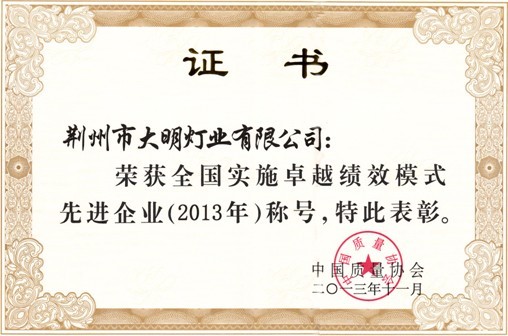 2013年11月3日,第十三屆全國追求卓越大會頒獎典禮在北京京西賓館順利召開,荊州市大明燈業(yè)有限公司榮獲全國實施卓越績效模式先進(jìn)企業(yè)稱號,成為荊州市此次唯一受到該項表彰的企業(yè)。 荊州市大明燈業(yè)有限公司是一家以生產(chǎn)各類照明產(chǎn)品的高新技術(shù)企業(yè)。自導(dǎo)入卓越績效模式以來,大明燈業(yè)一直致力于技術(shù)水平和管理水平的提升,通過學(xué)習(xí)和時間卓越績效模式,積極探索,開拓創(chuàng)新,經(jīng)過不懈努力,取得了顯著成效。此次獲得該榮譽(yù),代表著大明燈業(yè)的管理水平已經(jīng)達(dá)到了一個新的高度,極大地促進(jìn)了企業(yè)的經(jīng)營質(zhì)量水平和綜合競爭能力,樹立了全國實施卓越績效模式的先進(jìn)典型。 在此次表彰后企業(yè)會堅持持續(xù)改進(jìn),努力超越自我,不斷提高產(chǎn)品、服務(wù)和經(jīng)營質(zhì)量,增強(qiáng)核心競爭力,繼續(xù)為提高我國的綜合國力做出貢獻(xiàn)。