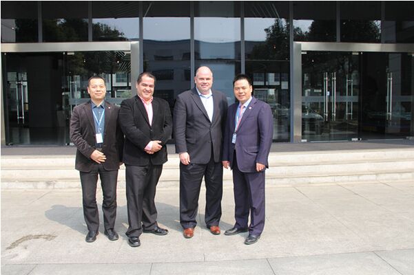 蔣錫培(右一)、蔣華君(左一)與GE運輸高級全球采購總經(jīng)理大衛(wèi)•考克斯(右二)、 全球電力電子件采購總監(jiān)候賽•莫利納(左二)合影