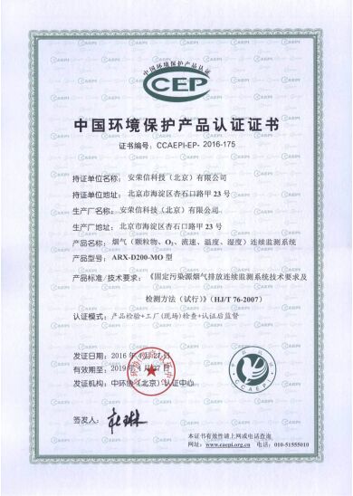 我公司自主研發(fā)生產(chǎn)的ARX-D200-MO煙氣顆粒物排放連續(xù)監(jiān)測系統(tǒng),順利通過環(huán)境保護部環(huán)境監(jiān)測儀器質(zhì)量監(jiān)督檢驗中心的復(fù)檢,取得合格檢測報告【編號:質(zhì)(認)字No.2016-069】,并取得中環(huán)協(xié)(北京)認證中心頒發(fā)的CCEP中國環(huán)境保護產(chǎn)品認證證書【編號:CCAEPI-EP-2016-175】 ARX-D200-MO型煙氣(顆粒物、O2、流速、溫度、濕度)排放連續(xù)監(jiān)測系統(tǒng),主要包含安榮信科技自主研發(fā)的抽取式煙塵儀LFS1000-MO、流速儀APT2000、氧分析儀及濕度儀。