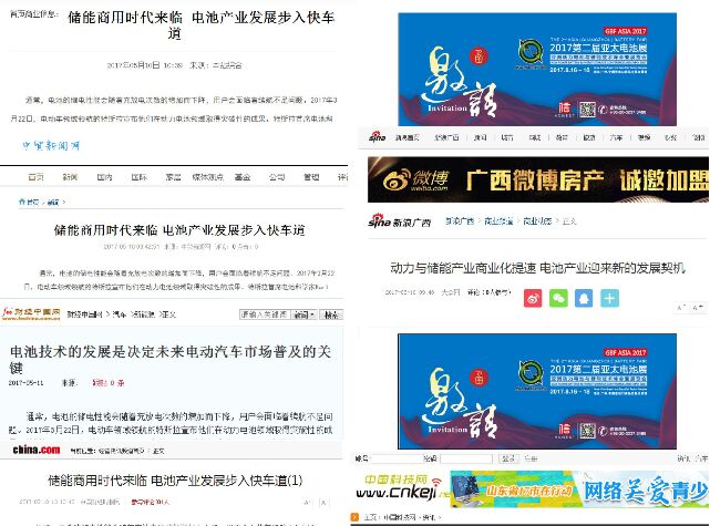 2017第二屆亞太電池展將于8月16-18日在廣州·中國(guó)進(jìn)出口商品交易會(huì)展館A區(qū)隆重舉行,近日,人民網(wǎng)、廣東經(jīng)濟(jì)網(wǎng)、廣東之窗、中國(guó)經(jīng)濟(jì)網(wǎng)、中國(guó)日?qǐng)?bào)網(wǎng)、深圳經(jīng)濟(jì)網(wǎng)、京華網(wǎng)(京華時(shí)報(bào))、中華網(wǎng)經(jīng)濟(jì)頻道、中國(guó)新聞網(wǎng)、中國(guó)網(wǎng)科學(xué)頻道、中國(guó)日?qǐng)?bào)網(wǎng)、中國(guó)貿(mào)易新聞網(wǎng)、中國(guó)科技網(wǎng)、中國(guó)財(cái)經(jīng)時(shí)報(bào)網(wǎng)、亞洲網(wǎng)新聞、新浪廣西、新華網(wǎng)巴中頻道、騰訊汽車、搜狐媒體、汽車點(diǎn)評(píng)網(wǎng)、齊魯在線、京華網(wǎng)(京華時(shí)報(bào))、環(huán)球汽車網(wǎng)、華訊財(cái)經(jīng)網(wǎng)、廣佛都市網(wǎng)、莞訊網(wǎng)、東莞信息港財(cái)經(jīng)、第一財(cái)經(jīng)網(wǎng)、大洋網(wǎng)新聞、財(cái)經(jīng)中國(guó)、新快網(wǎng)、網(wǎng)易、金羊網(wǎng)科技頻道、和訊河南頻道、廣州視窗、鳳凰網(wǎng)邵陽(yáng)汽車、東方財(cái)富網(wǎng)、大公網(wǎng)財(cái)經(jīng)頻道、21CN科技頻道、財(cái)經(jīng)界等近50家知名媒體對(duì)其進(jìn)行了報(bào)道。