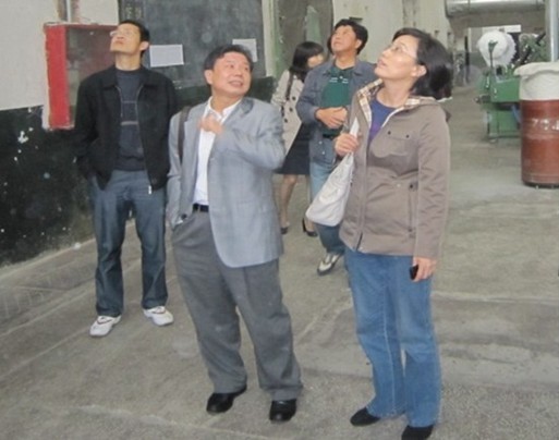 省節(jié)能中心孫偉明書(shū)記(右一)、荊州市發(fā)改委副主任夏循清(右二)、節(jié)能辦主任卓士軍(左一),在大明燈業(yè)銷(xiāo)售總監(jiān)文純陽(yáng)(左二)的陪同下,檢查荊州市華宇紡織有限公司高效照明產(chǎn)品的使用情況。