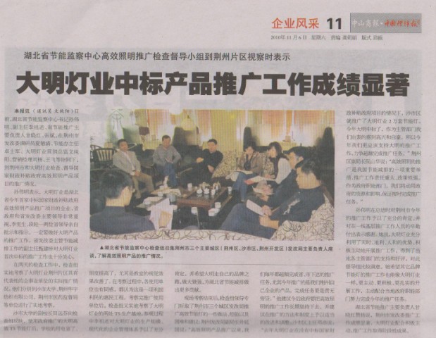 2010年10月14日—15日,湖北省節(jié)能監(jiān)察中心書(shū)記孫偉明、副主任李祖述、省節(jié)能推廣主要負(fù)責(zé)人甘曉紅、張斌,在荊州市發(fā)改委調(diào)研員夏循清,節(jié)能辦主任卓士軍,大明燈業(yè)營(yíng)銷(xiāo)總監(jiān)文純陽(yáng),營(yíng)銷(xiāo)經(jīng)理劉楊、王飛等的陪同下,到荊州市和大明燈業(yè)檢查、督導(dǎo)國(guó)家財(cái)政補(bǔ)貼政府高效照明產(chǎn)品項(xiàng)目的推廣情況。 孫偉明書(shū)記與陪同的荊州市發(fā)改委和大明燈業(yè)負(fù)責(zé)人說(shuō):大明燈業(yè)是我省今年首家中標(biāo)國(guó)家財(cái)政補(bǔ)貼政府高效照明產(chǎn)品推廣項(xiàng)目的企業(yè),省政府和省發(fā)改委主要領(lǐng)導(dǎo)非常重視,李憲生、段輪一兩位省長(zhǎng)親自批示和指示,一定要做好大明產(chǎn)品的推廣工作。省發(fā)改委主管節(jié)能減排工作的甄建橋副主任對(duì)大明燈業(yè)首次中標(biāo)的推廣工作也十分關(guān)心,這次要我和李主任帶隊(duì)到荊州市和大明燈業(yè)了解推廣工作的實(shí)際情況,以便更好的幫助本省企業(yè)做好推廣工作。 在兩天的檢查工作中,檢查組實(shí)地考察了大明燈業(yè)荊州片區(qū)具有代表性的企事業(yè)單位的實(shí)際推廣情況。他們分別到沙市大學(xué)、荊州華宇紡織有限公司、荊州市醫(yī)藥監(jiān)督局等單位進(jìn)行了實(shí)地考察。 沙市大學(xué)的田遠(yuǎn)芬副校長(zhǎng)向檢查組反映,使用政府推廣的大明高效T5節(jié)能燈后,學(xué)校的用電省了、照度提高了,尤其是教室的視覺(jué)效果改善了。學(xué)生普遍認(rèn)為,與過(guò)去鹵粉T8熒光燈相比,大明的三基色T5節(jié)能燈能使視覺(jué)疲勞明顯減輕,而且光質(zhì)量的改善帶來(lái)的心情愉悅使大家的學(xué)習(xí)效率大為提高。 在考察過(guò)程中,各使用單位也有同感,都普遍認(rèn)為這是一項(xiàng)利國(guó)利民的惠民工程。 考察完推廣使用單位后,檢查組又實(shí)地考察了大明燈業(yè)的兩處T5生產(chǎn)基地。參觀過(guò)程中李祖述副主任對(duì)大明燈業(yè)的生產(chǎn)規(guī)模、現(xiàn)代化的企業(yè)管理體系予以了充分肯定,并希望大明走自己的品牌之路,做大做強(qiáng),為我省的節(jié)能減排產(chǎn)業(yè)做成更多的貢獻(xiàn)。張斌先生是第二次訪問(wèn)大明燈業(yè),他說(shuō),與兩年前相比,無(wú)論是生產(chǎn)規(guī)模還是現(xiàn)場(chǎng)管理,大明都發(fā)生了很大變化,看了令人鼓舞。 現(xiàn)場(chǎng)考察結(jié)束后,15日上午,檢查組領(lǐng)導(dǎo)專門(mén)聽(tīng)取了荊州市三個(gè)城區(qū)發(fā)改局推廣高效節(jié)能燈的一些做法、經(jīng)驗(yàn)以及困難和建議。 荊州發(fā)改局孫延國(guó)副局長(zhǎng)說(shuō),高效照明產(chǎn)品推廣以來(lái),我們每年都超額完成省、市下達(dá)的推廣任務(wù),尤其今年推廣的是我們荊州自己企業(yè)的產(chǎn)品,完成任務(wù)更是責(zé)無(wú)旁貸。他建議今后政府要把高效照明的推廣工作長(zhǎng)期堅(jiān)持下去,并建議在推廣的方法和制度上予以適當(dāng)?shù)母倪M(jìn)和調(diào)整。沙市區(qū)鄧浩主任說(shuō),去年我們大明燈業(yè)在沒(méi)有中標(biāo)國(guó)家財(cái)政補(bǔ)貼政府項(xiàng)目的情況下,我們沙市區(qū)就推廣了該公司2萬(wàn)套節(jié)能燈。今年大明中標(biāo)了,作為主管部門(mén)我們由衷的感到高興和自豪。所以今年我們更應(yīng)該支持大明的推廣工作,力爭(zhēng)超額完成推廣任務(wù)。荊州區(qū)阮山華副局長(zhǎng)說(shuō):高效照明的推廣是我國(guó)節(jié)能減排的一項(xiàng)重要舉措,推廣工作責(zé)任重大、政策性強(qiáng)。作為政府職能部門(mén),我們將動(dòng)用政府的資源和影響,保證按時(shí)完成推廣任務(wù)。 接著卓科長(zhǎng)代表荊州市發(fā)改委朱主任匯報(bào)了荊州市推廣工作的具體情況和做法。在談到推廣工作的難點(diǎn)和經(jīng)驗(yàn)教訓(xùn)時(shí),卓士軍認(rèn)為,政府在下達(dá)推廣任務(wù)時(shí),應(yīng)該動(dòng)員全社會(huì)的力量而不僅僅是發(fā)改委這一個(gè)部門(mén),而且對(duì)推廣工作在資金、人員、甚至主要領(lǐng)導(dǎo)的參與、決策等方面都要有具體的支持和明確的要求。這樣可能效果會(huì)更好一些、困難會(huì)更少一些。 孫書(shū)記在總結(jié)時(shí)對(duì)荊州市今年的推廣工作予以了充分的肯定,并對(duì)在一線基層推廣工作人員的辛勤付出表示感謝。她說(shuō),離10月31日推廣工作的截止時(shí)間已經(jīng)不多了,大家應(yīng)該克服困難、再接再礪,力爭(zhēng)超額完成任務(wù)。她又說(shuō),大明燈業(yè)充分利用了天時(shí)、地利、人和的優(yōu)勢(shì),積極主動(dòng)地開(kāi)展推廣工作,得到了當(dāng)?shù)馗髦鞴懿块T(mén)的支持和好評(píng),對(duì)此我們督導(dǎo)組比較滿意。她希望其它品牌節(jié)能燈的推廣工作也能像大明燈業(yè)一樣,更主動(dòng)、更積極、更扎實(shí)的開(kāi)展工作,主動(dòng)配合當(dāng)?shù)卣毮懿块T(mén)努力完成今年的推廣任務(wù)。 大明燈業(yè)營(yíng)銷(xiāo)總監(jiān)文純陽(yáng)在發(fā)言中對(duì)省發(fā)改委、省節(jié)能監(jiān)察中心、荊州市發(fā)改委及市直各縣市、區(qū)發(fā)改局